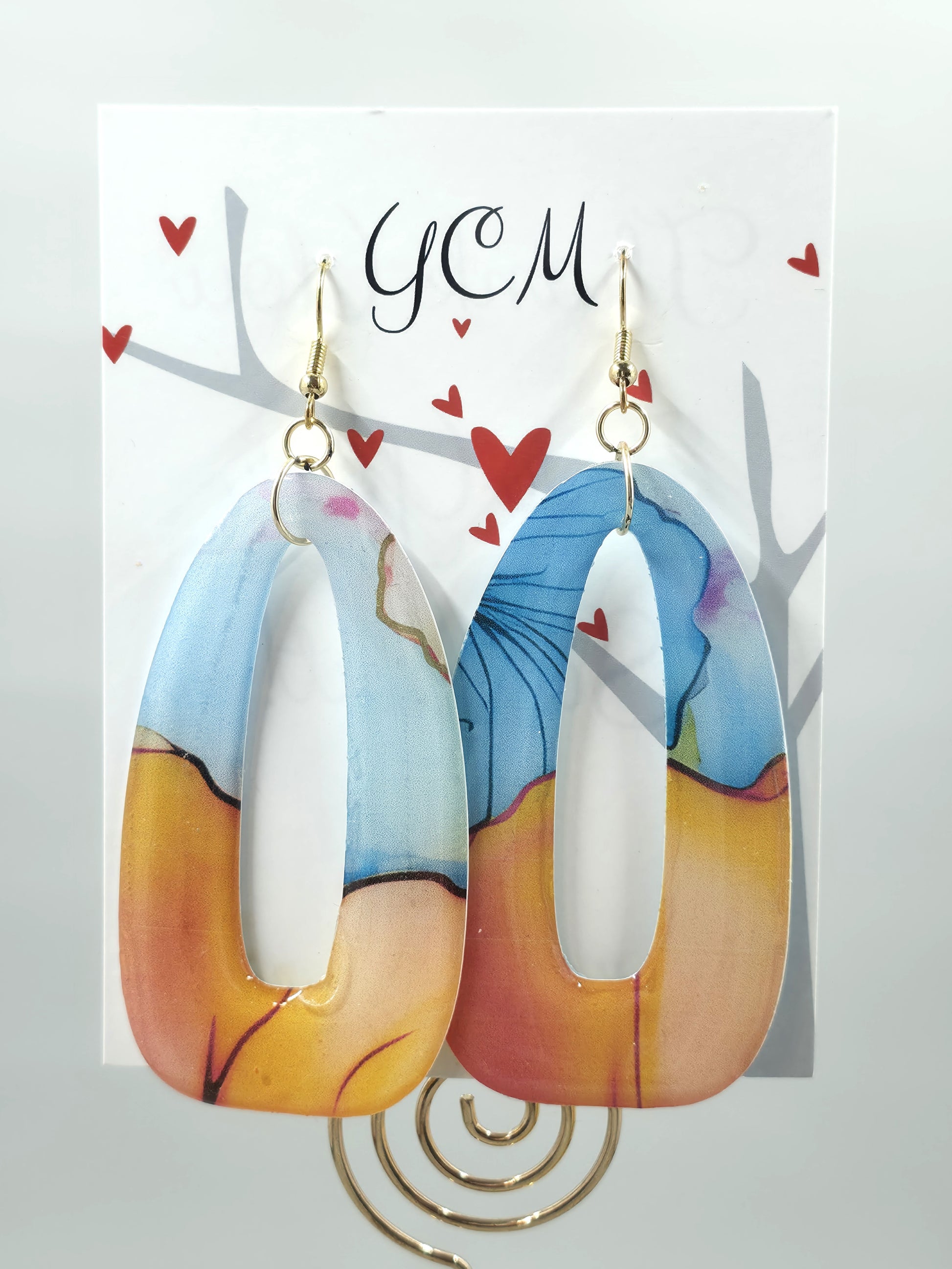 These unique earrings combine vibrant orange and blue hues on resin-coated Yupo paper, offering a striking, durable accessory. The smooth resin finish enhances color vibrancy and protects the delicate paper base, ensuring long-lasting wear. Perfect for those seeking expertly crafted earrings that balance artistic flair with wearability.